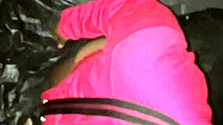 French housewife slave performs outdoor public exhibition with bondage and dildo masturbation in leather harness as humiliated maid