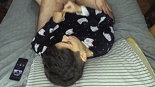 wasted cumshot after quickie bed blowjob handjob pov