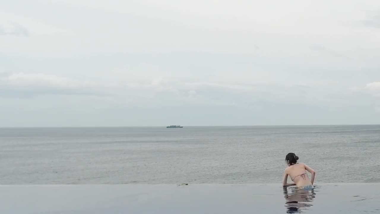Skinny student with cute legs relaxes by the infinity pool